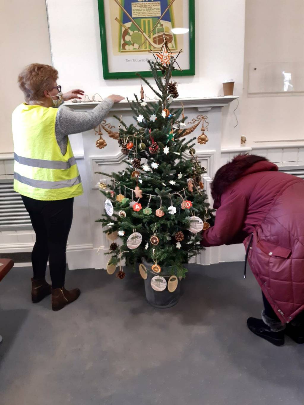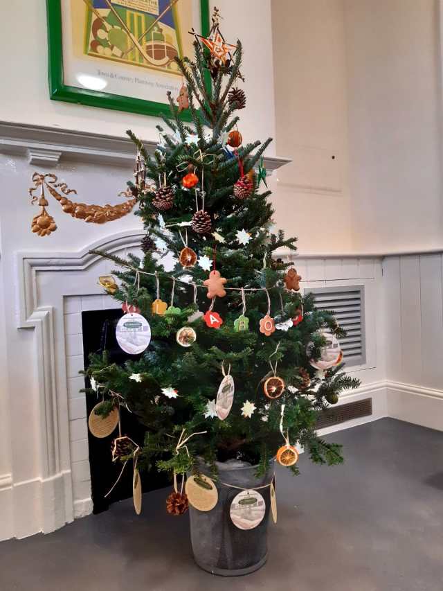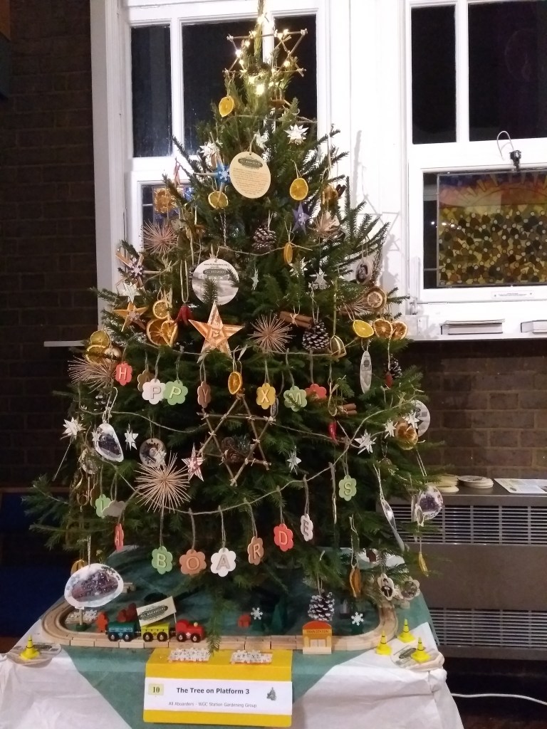 This week the volunteers have re-created their award winning “Tree on Platform 3” in the newly revamped waiting room – on Platform 3! Last year the team entered a tree into the annual St Francis Church Christmas Tree Festival and came out top in the public vote. It was decorated with an eco-friendly theme including recycled train ticket stars, a variety of items from natures bounty and hand made garlands. This year, in a doubly eco friendly fashion, the tree was recreated with saved items along with some fresh bits and pieces including our information coasters. The tree was kindly provided by new station manager Karen and decorated in a socially-distanced covid-safe manner.