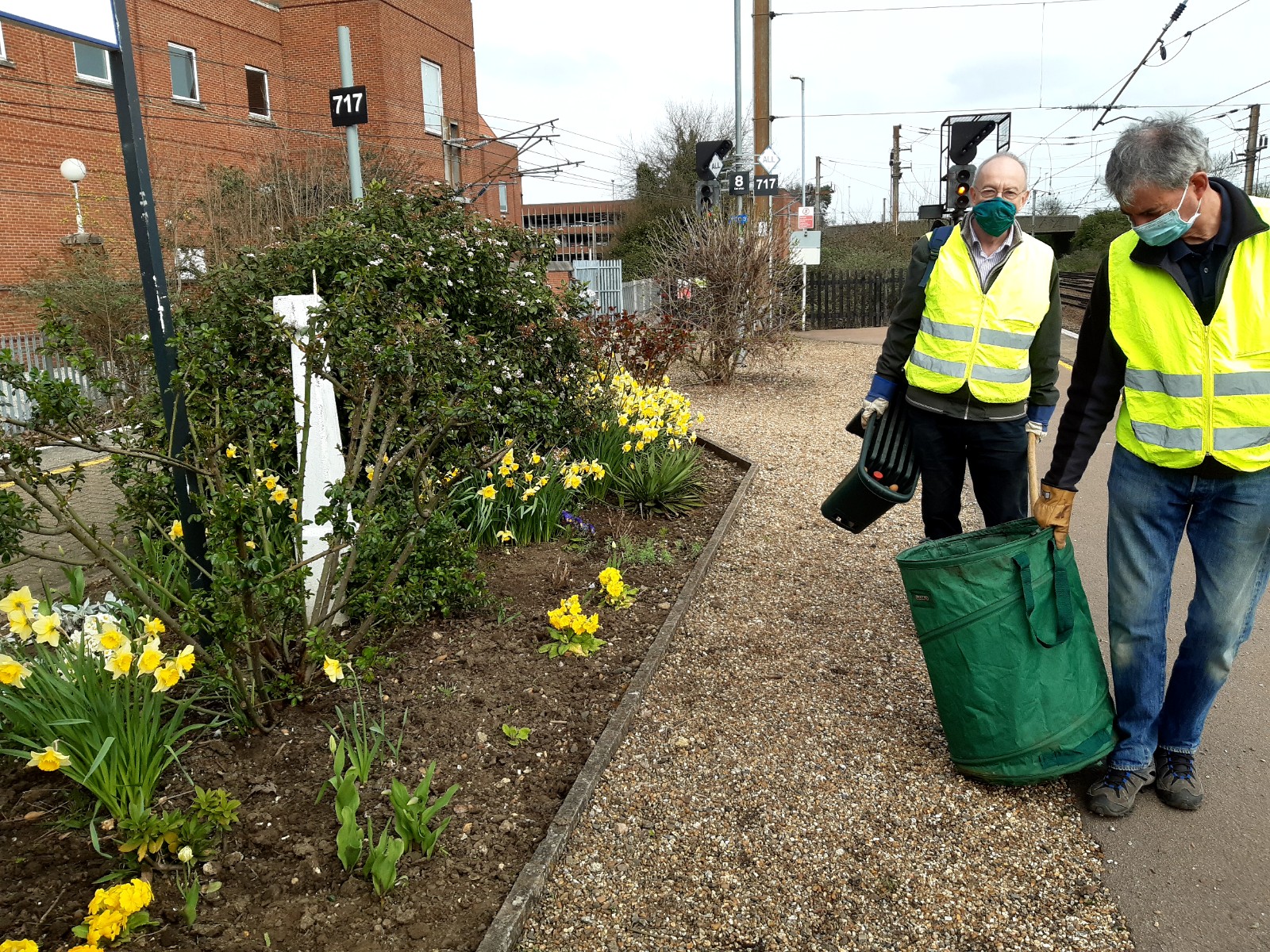 As coronavirus restrictions ease we are able to resume gardening once more in small groups. We were pleased to find spring flowers in abundance and fresh growth peeping through. The tulip and hyacinth bulbs were donated by Welwyn Hatfield Borough Council as surplus stock. The teams pruned and weeded the beds ready for new planting schemes to go in later in the year.