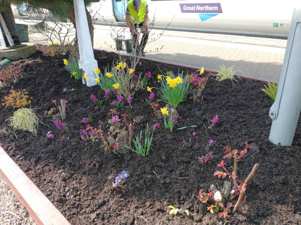 Last year GTR edged the beds on platform 3/4 using wooden sleepers which were then treated for longevity. These beds roughly follow the original layout of the station and will help us to establish more plants in these area. GTR also cut the huge hedges here back to more manageable sizes, which really showcases the lovely scots pines. We are now filling these beds with lovely local organic compost and soil conditioner from Equigrow ready for some new plants! As you can imagine the logistics for all of this on a working train station can be challenging, so many thanks to all involved in this operation.