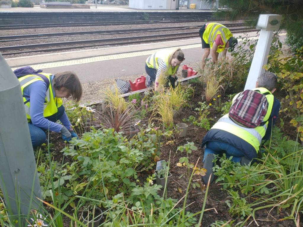 The beds on platforms 3/4 were enhanced with edging a year ago by rail contractors, and then filled with compost by volunteers in spring. They feature some of the old (original?) roses, the wonderful pine trees, witch hazel and some other mature shrubs. But there was still plenty of space for more!