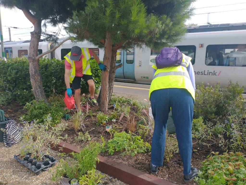 Antony Henn, local nurseryman and owner of Garden on a Roll came to a volunteer session with a van full of plants. He used his expert knowledge to arrange the plants around the various beds, explaining which would prefer each position and any specific plant care. We know we can trust Antony as the beds on the opposite platforms that he planted up a number of years ago look fabulous.
