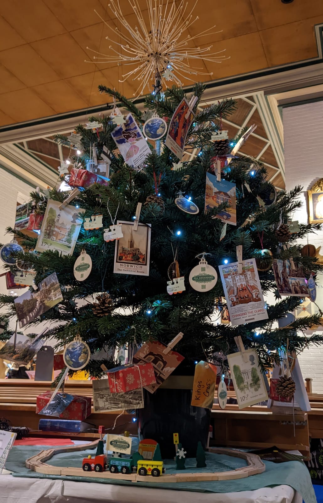 We once more decorated a tree for the St Francis Christmas Tree Festival. With our twin themes of rail travel and sustainability the team crafted decorations from travel postcards, old train tickets and items from the garden. The beautiful tree topper is a dried allium seed head carefully preserved by a volunteer. The living tree was wheelbarrowed back to the station after the festival and now brightens up the waiting room for passengers.